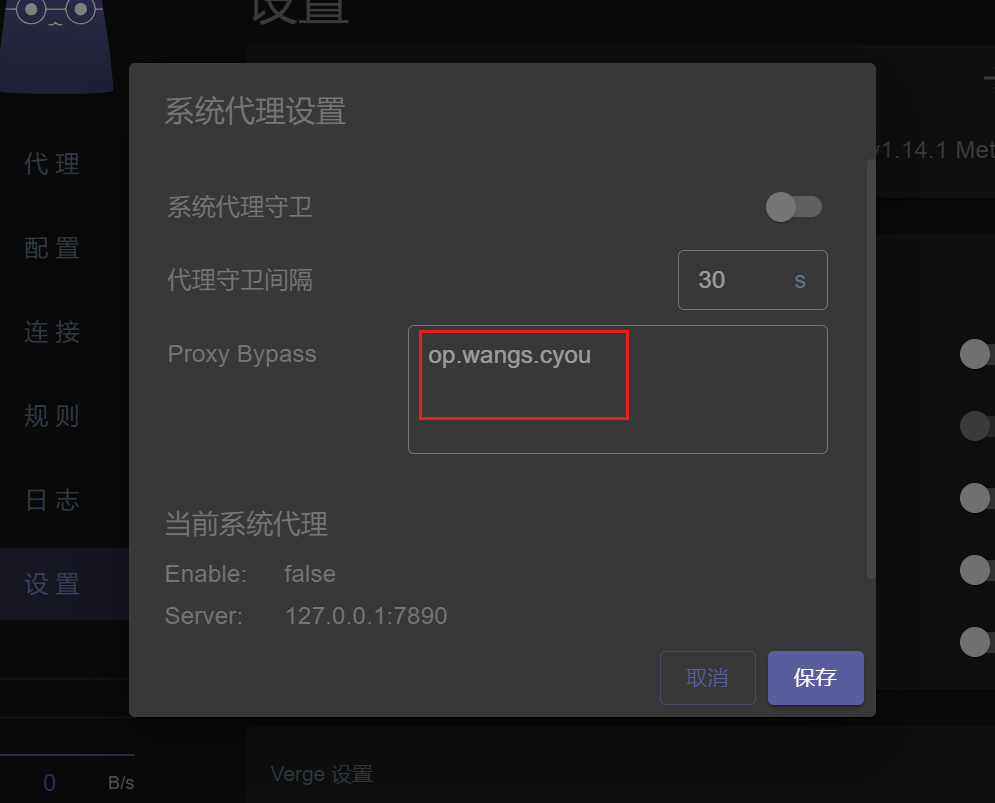 对于clash-verge,点击设置->系统代理后的齿轮,将自己需要使用本机hosts的域名填入即可