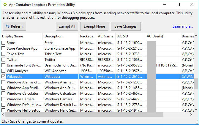 开启系统代理后,windows应用商店不能访问,是因为uwp的应用程序都默认不允许本地回环代理(127.0.0.1),需要使用工具来解锁此限制 工具:https://telerik-fiddler.s3.amazonaws.com/fiddler/addons/enableloopbackutility.exe 选中所有(如果不想解锁全部uwp,那就只选应用商店),点击“save changes”